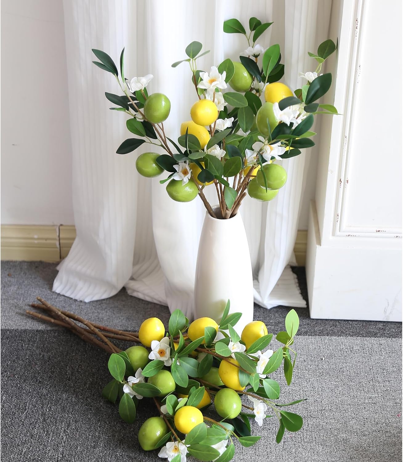 Maintenance-Free : Unlike live lemon plant or real citrus, these artificial lemon branches (fake lemon tree branches) require no watering, pruning, or care – they stay vibrant and lifelike year after year! The cheery lemons, fake limes, soft artificial lemon blossoms, and green foliage maintain their real look forever, making them ideal for busy lifestyles and long-lasting lemon decor. Ships folded for protection; simply reshape the flexible stems to restore fullness. Note: Vases are not included; slight color/dimension differences may exist due to lighting and manual measurement.