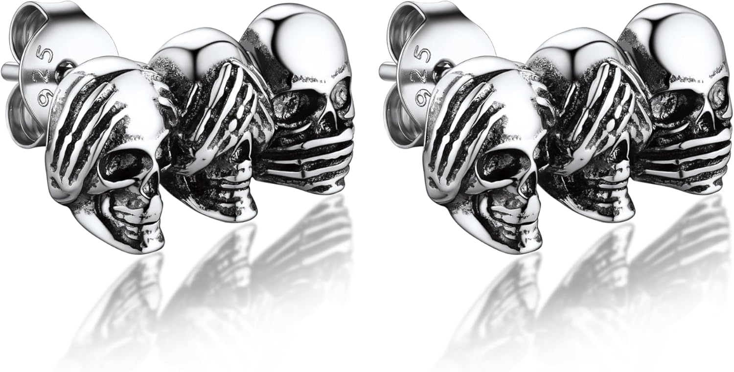 Bandmax 925 Sterling Silver Skull Stud Earrings Hoop Earrings for Women Men Punk Gothic Halloween Skull Skeleton Earring Studs Hoops
