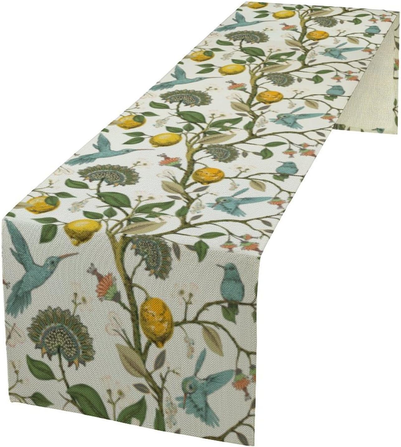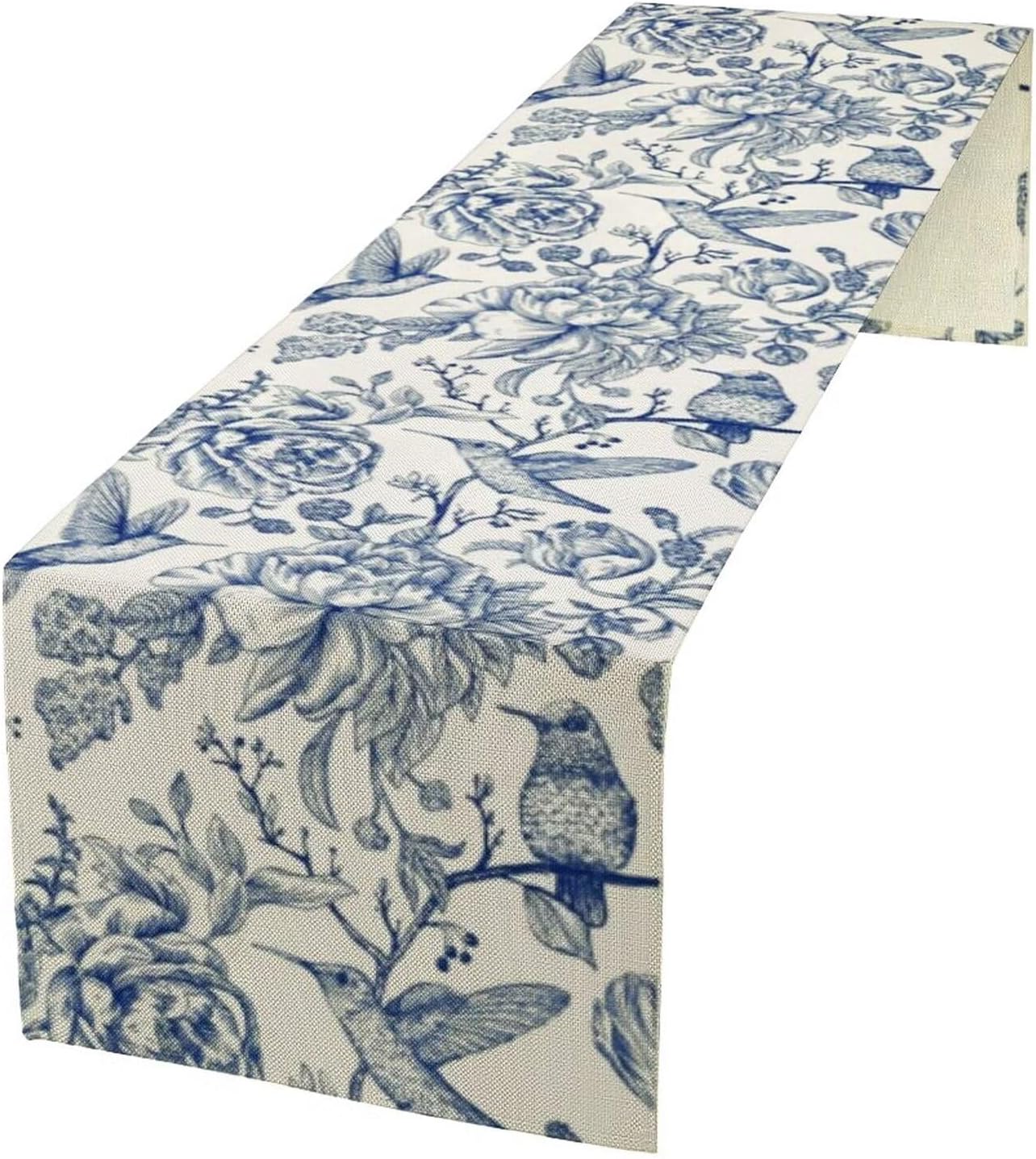 Blue and White Table Runner,Retro Monochrome Sketch Birds Flowers Summer Table Runner,Seasonal Spring Fall Kitchen Dining Table Decoration for Home Party Decor 13x90 Inch