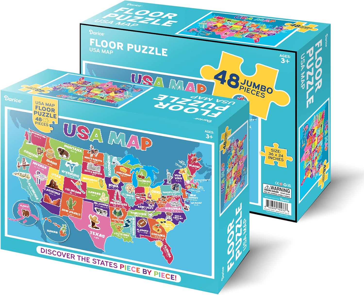 Explore the United States from coast to coast without ever leaving your living room!The Darice USA Map Floor Puzzle is a vibrant, 48-piece educational jigsaw puzzle designed to make learning geography a massive amount of fun.How it Works: Simply clear a space on the floor and let your child connect the jumbo pieces. As they build the map, they will match shapes and colors while naturally familiarizing themselves with the layout of the country, state names, and capital cities.Why You’ll Love It:Educational Play: Seamlessly blends fun with fundamental geography lessons.Durability: Thick, sturdy pieces withstand enthusiastic toddlers.Visual Appeal: Bright graphics and fun icons keep kids highly engaged.What’s in the Box?:48 Jumbo USA Map Puzzle Pieces1 Sturdy Storage BoxSpecs/Details:Players: 1 or moreAges: 3+Goal: Assemble the map and learn the states!Dimensions: 36" x 24" (Assembled Puzzle); Box is 11.75" W x 9.25" H x 3" L. Weight: 3 lbs.